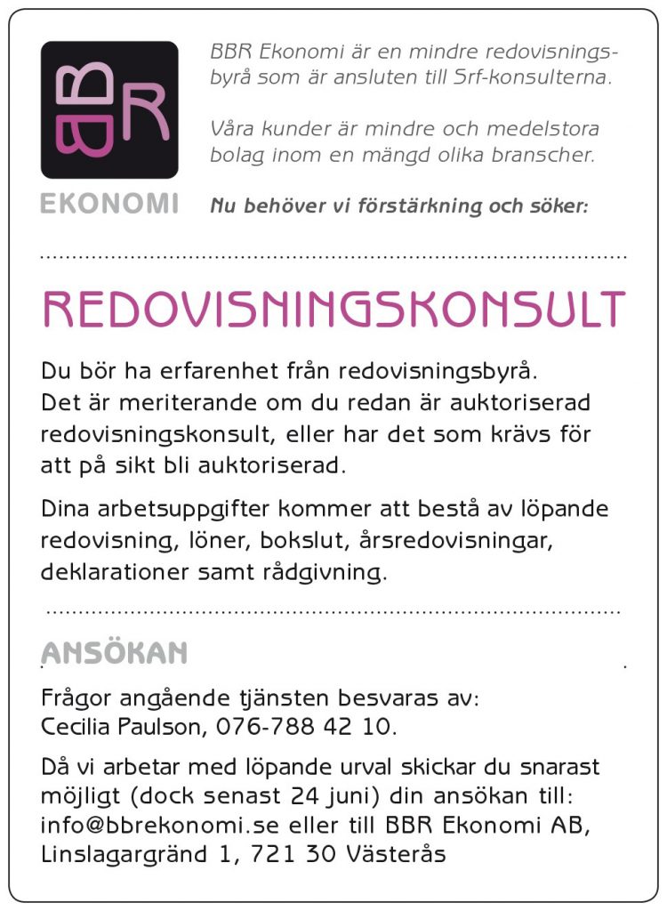 BBR Ekonomi AB är en mindre redovisningsbyrå som kan hjälpa dig med det mesta inom redovisningsområdet. Bland utbudet av våra tjänster kan vi nämna löpande redovisning, bokslut, deklarationer samt bemanningstjänster på plats ute hos våra kunder.